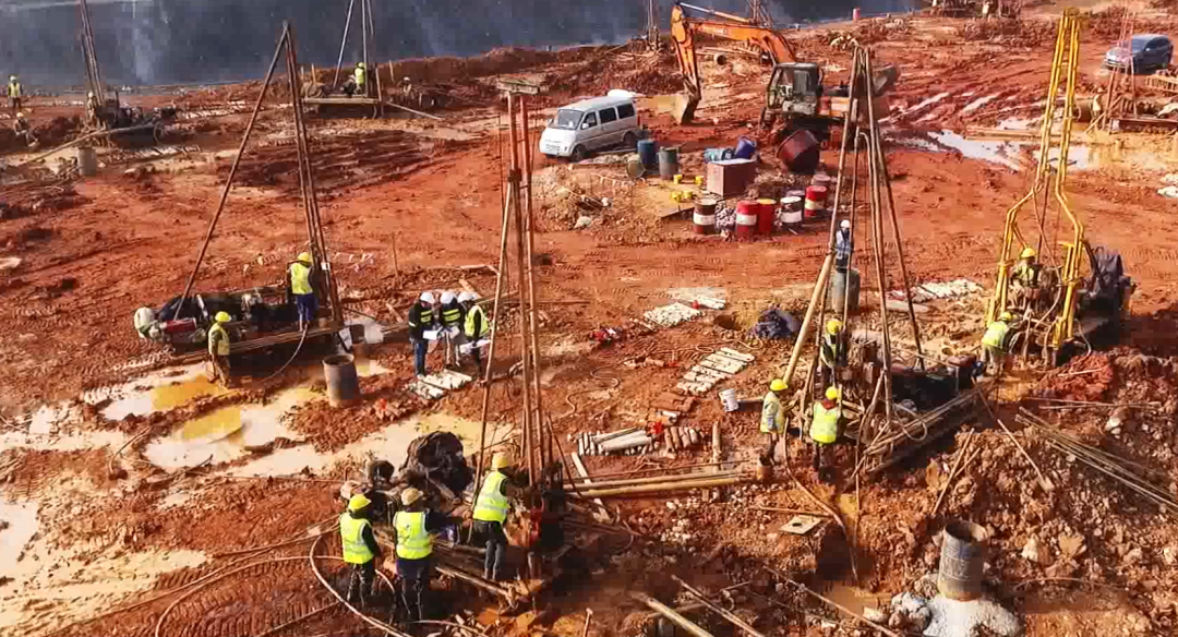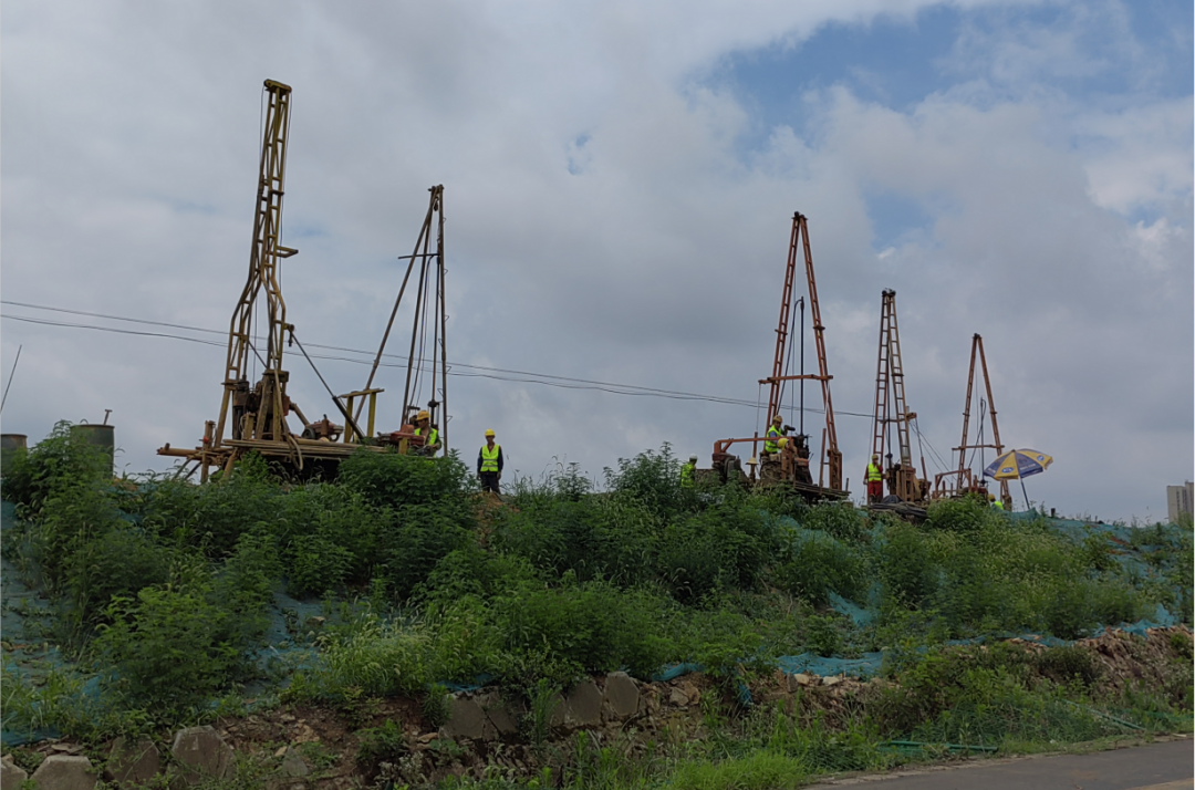 在施工勘察階段,根據業主要求,勘察需與施工同步進行,彼時正值基坑開挖,作業面少,但項目任務重、時間緊。在接到業主進場通知后,團隊迅速召集了近百臺鉆機及相關作業人員,就作業面少問題,團隊人員不斷與施工總包方溝通協調并制定施工、勘察方案,最終通過團隊的拼搏努力及與總包方的密切配合,順利完成了施工勘察任務。